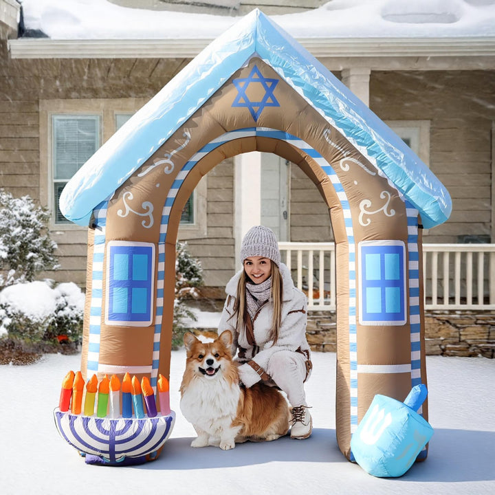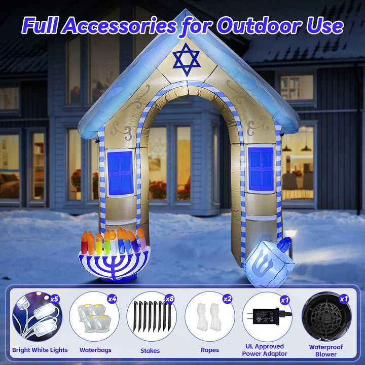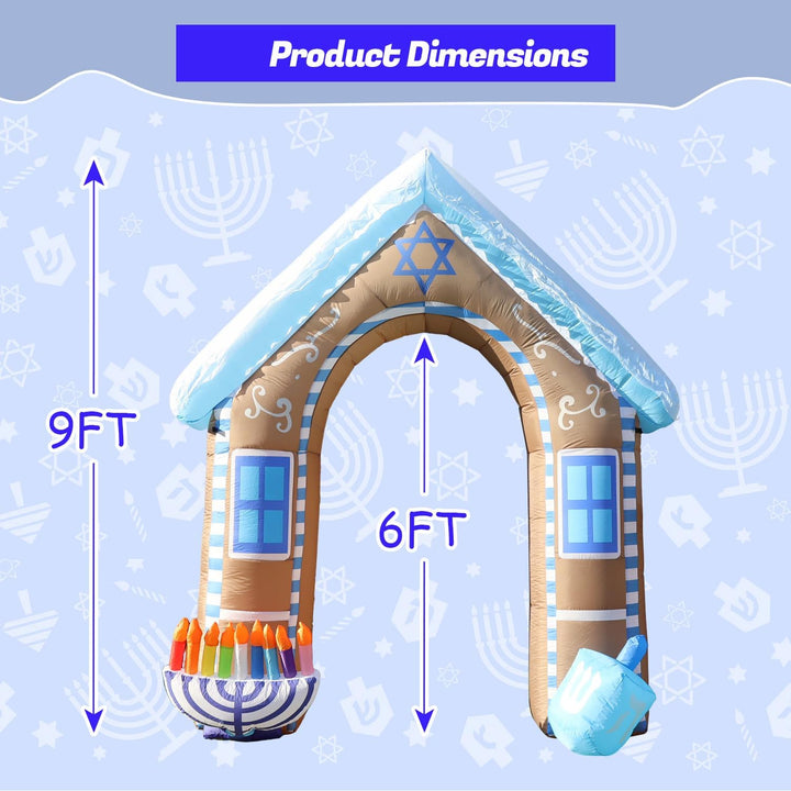 - Hanukkah Inflatable Decorations: this 8ft Hanukkah inflatable arch with menorah dreide and star decoration creates a truly joyful holiday atmosphere. Get ready to delight your family, neighbors and guests.