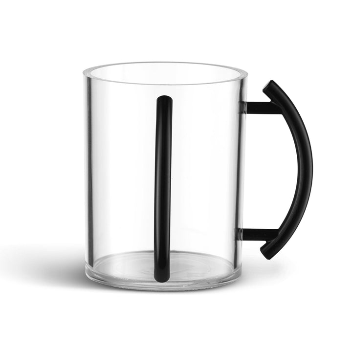 Acrylic Netilat Yadayim Wash Cup with clear body and black handles, designed for durability and ease of cleaning; size 5.2 inches tall, 6 units per case.