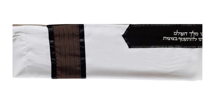 Distinguished Black, Brown and Red Stripes Decorated Tallit with a unique combination of Black Satin ribbons and Taffeta Atarah.