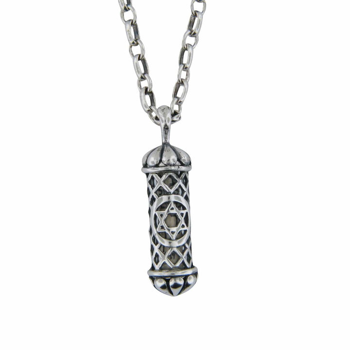 This sterling silver filigree mezuzah (amulet) necklace is intricately designed by Michael Bromberg who has captured the essence of the captivating beauty known as filigree art. The art of filigree dating back to ancient times, is a delicate craft in which metalwork made with twisted threads usually of gold and silver or stitching of the same curving motifs. The Hebrew letter “shin” that is present on one side of this amulet, is thought to bring luck and protection to those who wear it. On the other side, The Star of David. There are many ideas as to what the symbolic meanings of the Star of David are. Some Kabbalists believed that the six points represented God's absolute and infinite power over the universe in all six directions: north, south, east, west, up and down. Kabbalists also believed that the triangles represented humanity’s dual nature (good and evil) and that the star could be used as protection to ward off against evil spirits. The structure of the star, consisting of two overlapping triangles, has also been thought to represent the relationship between God and the Jewish people. The star, which points up, symbolizes God and the star, which points down, represents us here on earth.- Materials: Silver, , Shema scroll