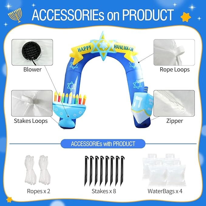 - Hanukkah Inflatable Decorations: this 8ft Hanukkah inflatable arch with menorah dreide and star decoration creates a truly joyful holiday atmosphere. Get ready to delight your family, neighbors and guests.