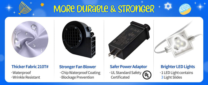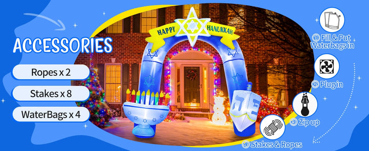 - Easy Setup and Storage: Self-inflates and deflates. Just plug in the built-in fan, secure it to the ground, and it inflates within seconds. With built-in water bags and ropes for stability, no worries about wind blowing the Hanukkah inflatable arch away. Instant pop-up Hanukkah fun!