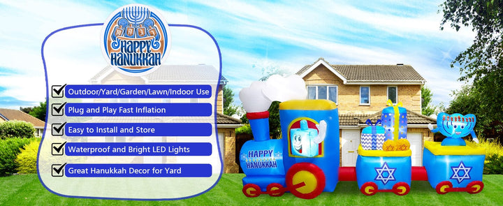 - Unique Hanukkah Outdoor Decorations: Our Hanukkah inflatables train menorah symbolizes a miracle. It is waterproof-rated and UL-listed. Perfect for placing home, indoors, outdoors, front door, yard, patio, lawn, garden, porch, and more. The inflatable train menorah yard decoration is also suitable for indoor outdoor party events and Hanukkah gifts for kids and family.