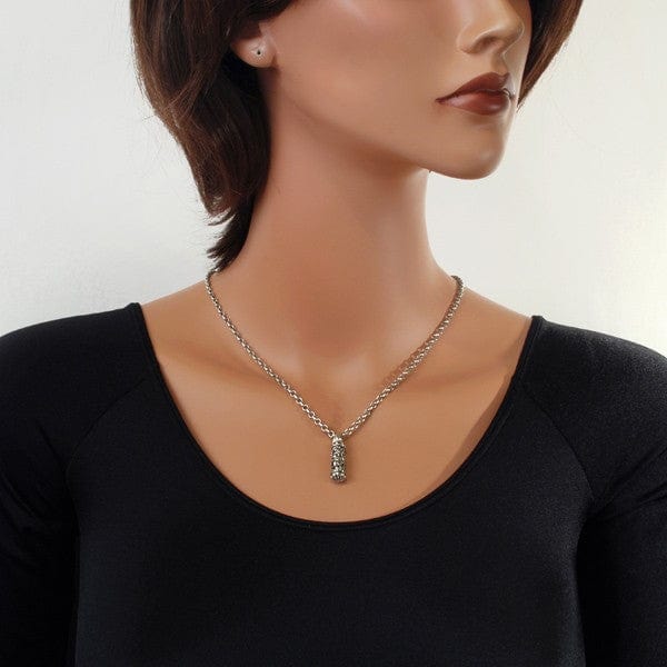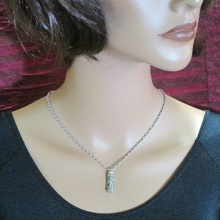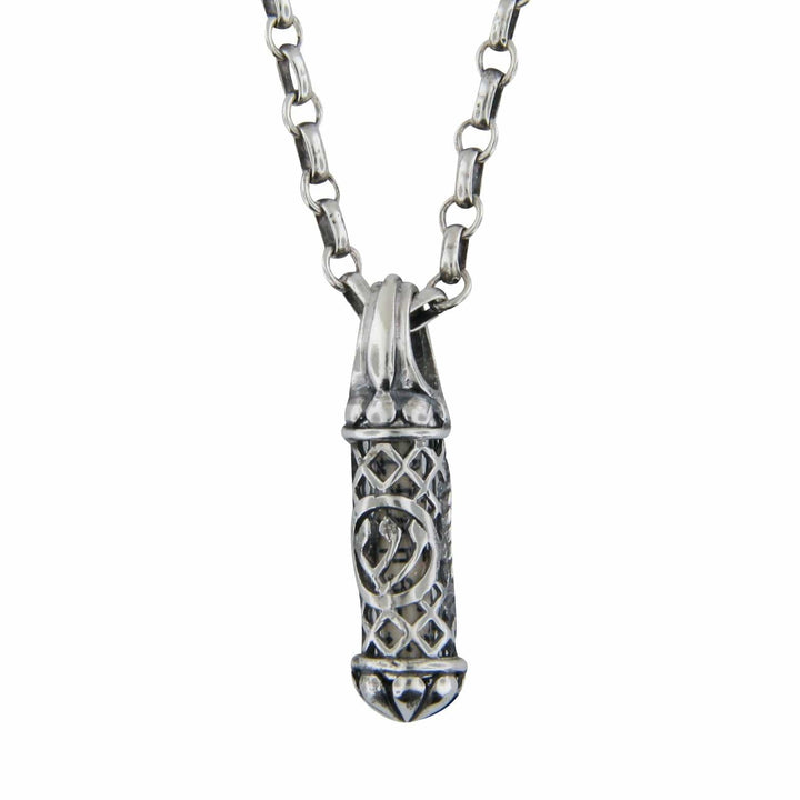 This sterling silver vertical mezuzah (amulet) necklace features intricate and unique designs around the top and bottom of the amulet itself, and a Lion of Judah in the center. Inside, a parchment which contains the prayer "Shema Yisrael "Hear O' Israel". It is believed that when one wears it or keeps it close to them that they are protected and out of harms way. Please note that the parchment included is not kosher.- Materials: Silver, , Shema scroll