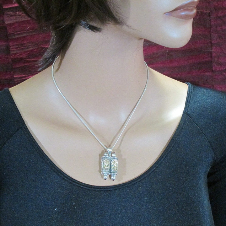 Torah Scroll Pendant. Absolutely unique piece of Judaica jewelry. The 14k gold doors of this Torah-shaped sterling silver pendant open to reveal a symbolic Torah scroll, which can be turned using the small handles. Menorah, Star of David and small Shin decorate the pendant's rear.- Materials: Silver, 14K gold, Shema scroll