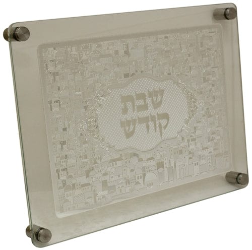 Tempered Glass Challah Tray On Legs With Lazer Cut Design - Silver - ACT1308S - 15.5W x 11.75L 1.5H