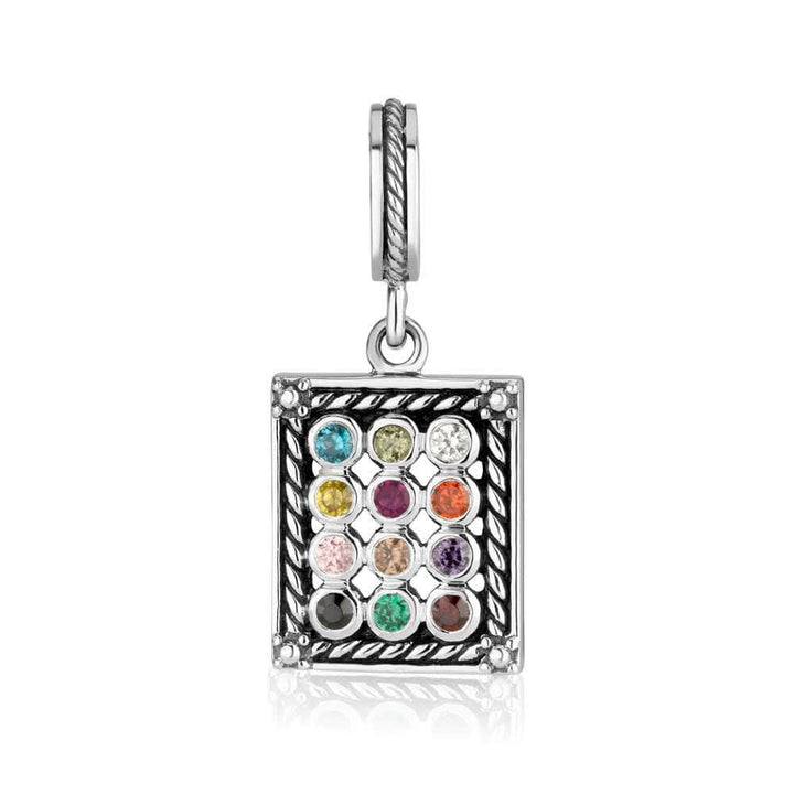 A magnificent rectangular Silver 12 Tribes Hoshen hanging bead charm with milgrain design resembling the choshen, or breastplate, worn by the High Priest in the Holy Temple. Twelve multicolored precious stones are set in the choshen. White gift box White gift box