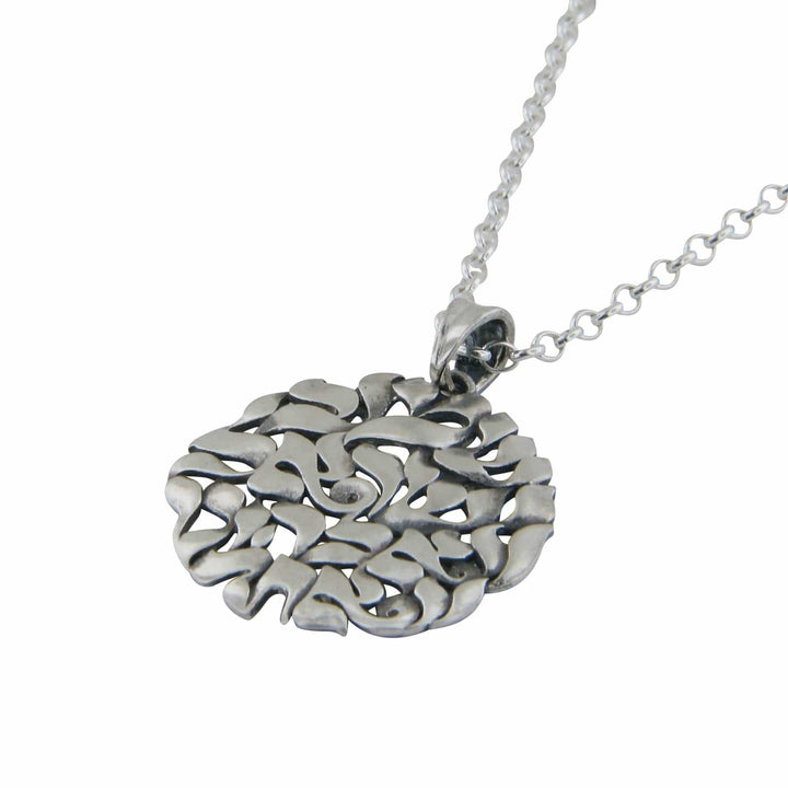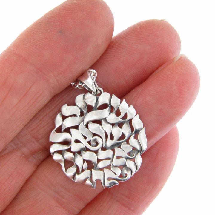 Medium Shema Sh'ma Yisrael Round Frameless 3D Pendant Necklace Silver Rolo Chain