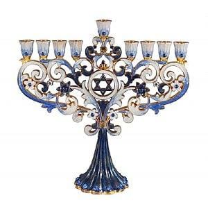 Artistic Jeweled Menorah - Floral blue tones and Gold plating. A very unique and heartwarming style featuring a floral theme. Collectible yet functional, makes a great Judaica gift year round. This Menorah is hand painted with rich color enamel and set with colored crystals. Comes gift boxed. Design and decoration is on both sides of the Menorah. 7.5" x 7.5" x 2". is a designer Judaic artifact made specially for ahuva
