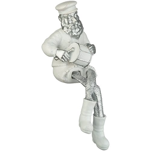 חסיד יושב מפולירייזן לבן עם רגלי בד כסף 25 ס"מ מנגן בתוף