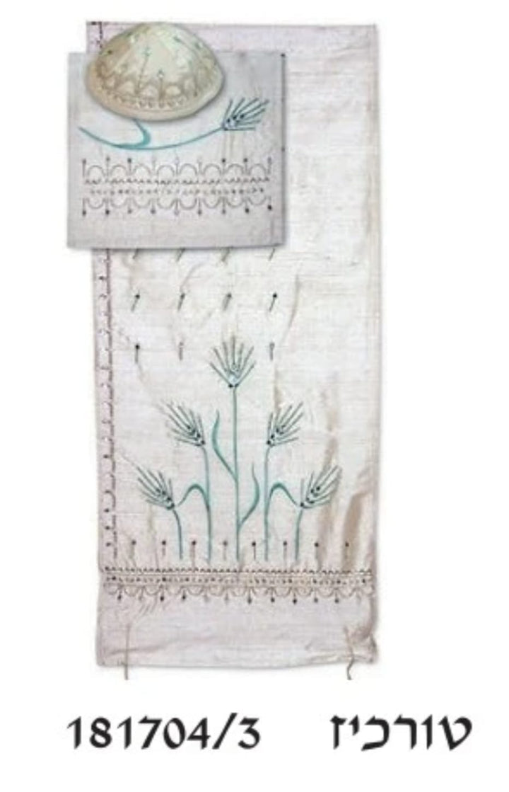 Exquisite Beaded Tallit with fancy design in matching embroidery that subtly matches the beads on this tallit design. This elegant embroidered wild silk tallit is complemented by a matching tallit bag and Kippah. Free Hard Plastic Carry case included. Beautiful & exquisite tallit choice for both Men and Women.