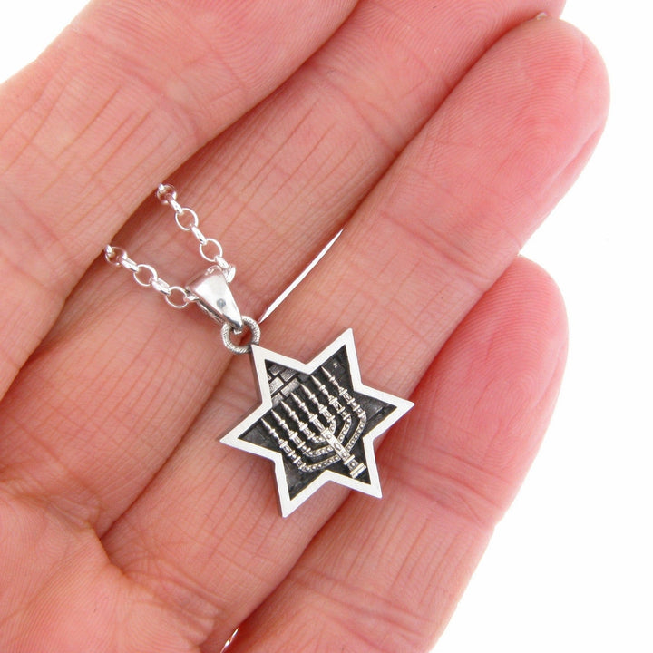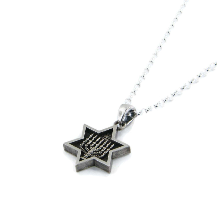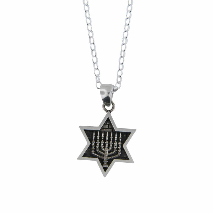 Star of David Menorah Pendant Necklace Silver on Rolo Chain Bar-Mitzvah Boys, Teens
