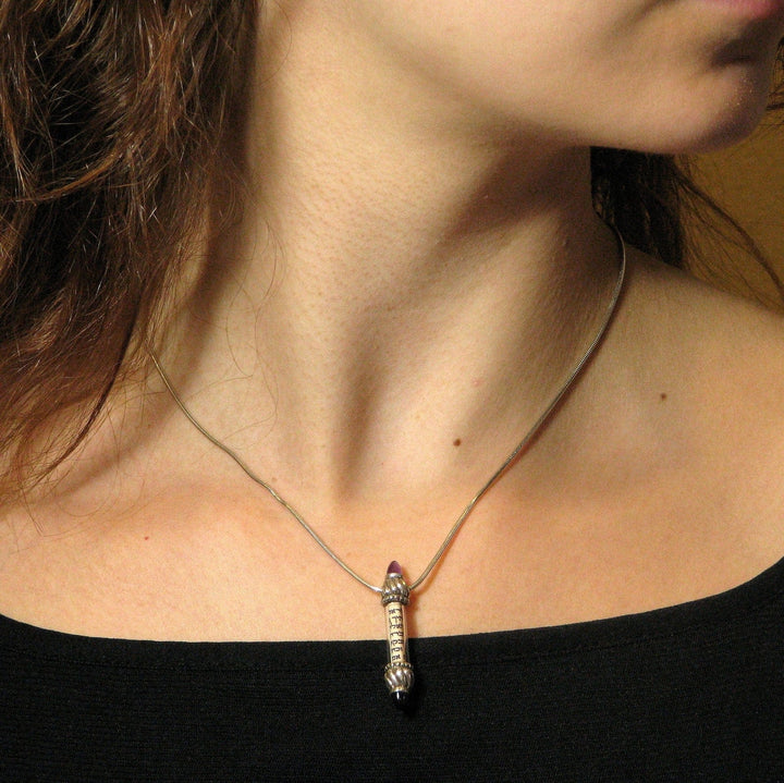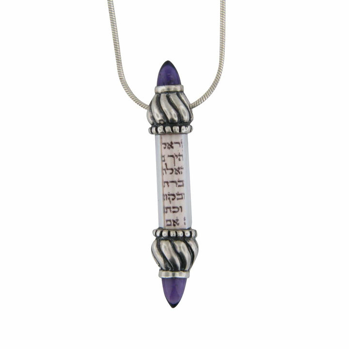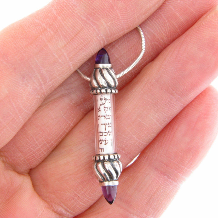 This sterling silver vertical mezuzah (amulet) necklace features a amethyst stone on the top and bottom, and also features a parchment which contains the prayer "Shema Yisrael "Hear O' Israel". It is believed that when one wears it or keeps it close to them that they are protected and out of harms way. Please note that the parchment included is not kosher.- Materials: Silver, , Shema scroll