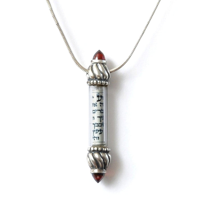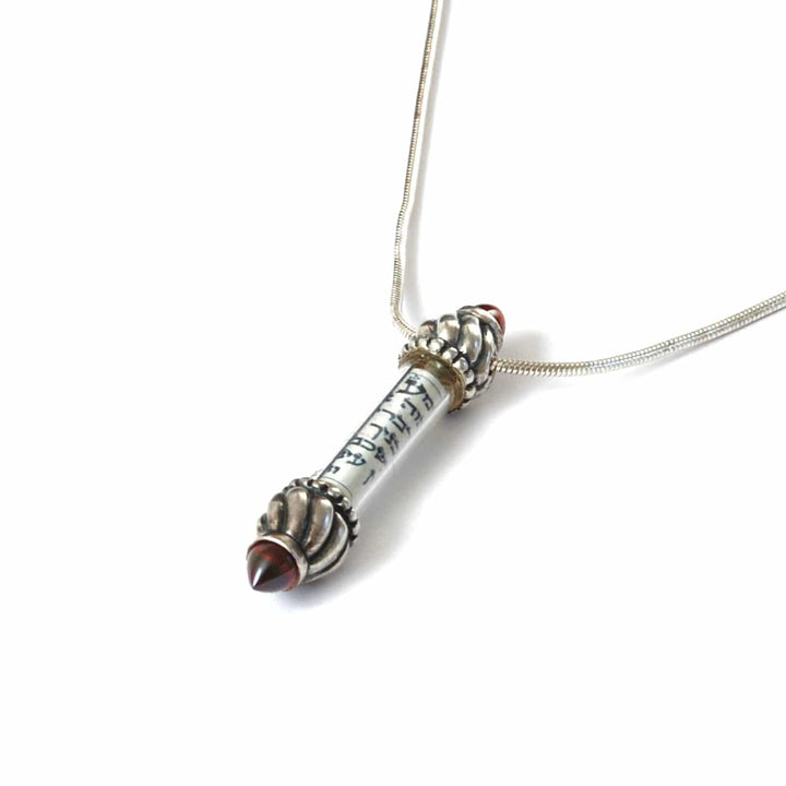 Vertical Mezuzah Pendant Necklace Silver Garnets Shema scroll on Snake Chain 1mm