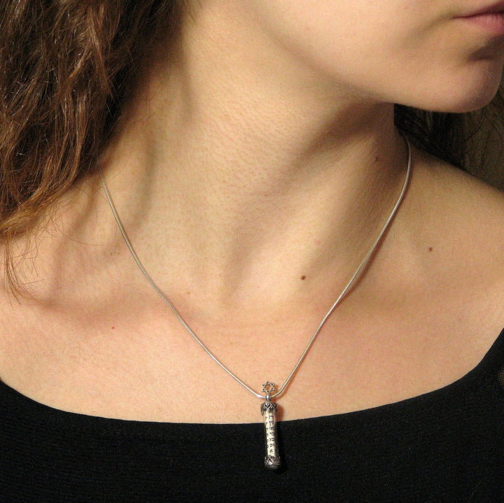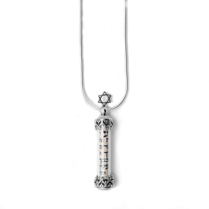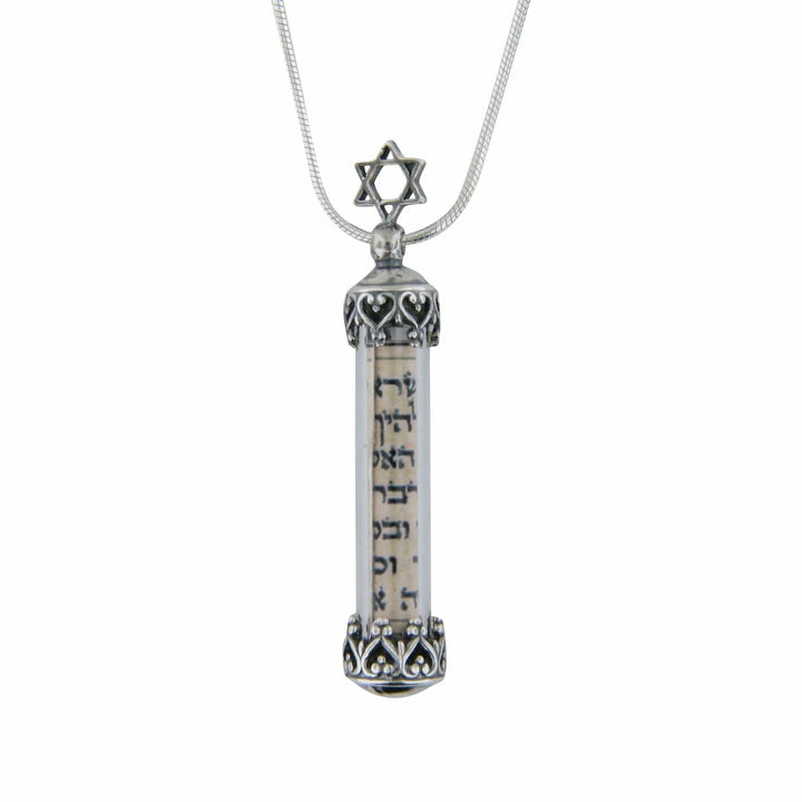 This sterling silver vertical mezuzah (amulet) necklace features intricate and unique designs around the top and bottom of the amulet itself, and a Star of David at the very top. Inside, a parchment which contains the prayer "Shema Yisrael "Hear O' Israel". It is believed that when one wears it or keeps it close to them that they are protected and out of harms way. Please note that the parchment included is not kosher.- Materials: Silver, Star of David, Shema scroll