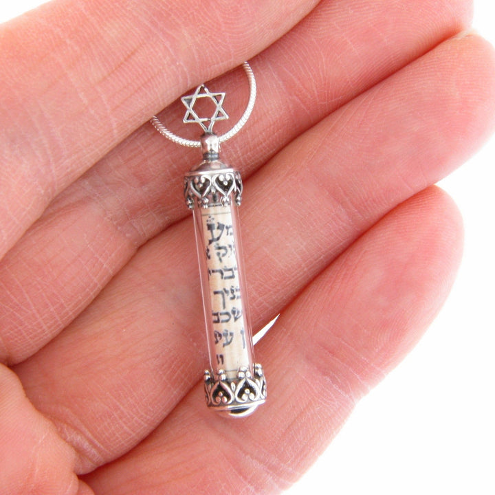 Vertical Mezuzah Pendant Necklace Silver Star of David Shema scroll on Snake Chain 1mm
