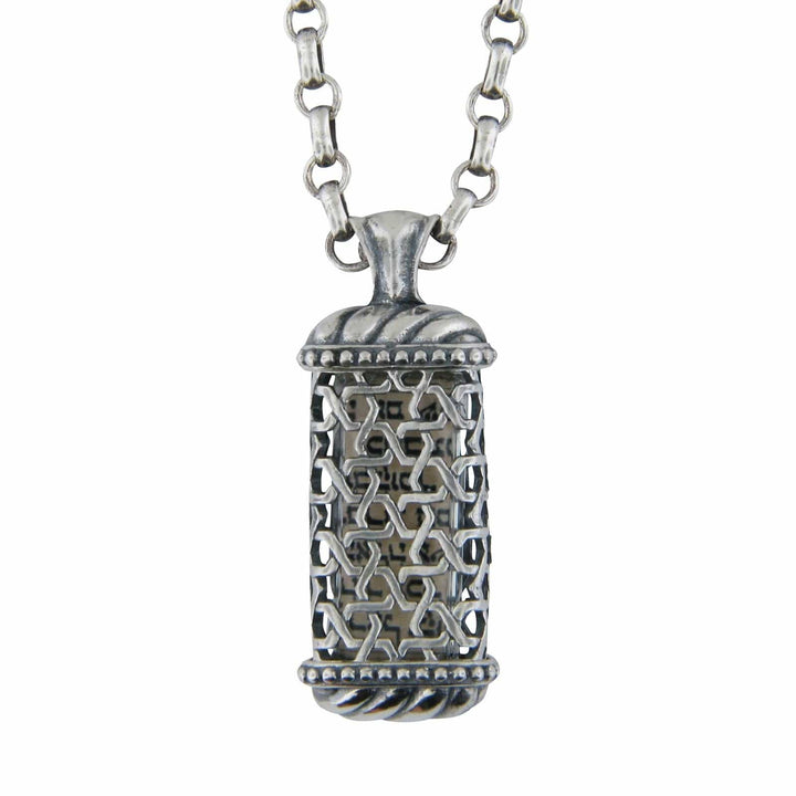 This sterling silver rectangular mezuzah (amulet) necklace features intricate and unique design with cutout Stars of David pattern resembling medieval Moorish Spain (Andalusian) architectural elements covering the body of the amulet. A 14k gold Winged Lion of Judah adorns the front of the amulet. Inside, a parchment which contains the prayer "Shema Yisrael "Hear O' Israel". It is believed that when one wears it or keeps it close to them that they are protected and out of harms way. Please note that the parchment included is not kosher.- Materials: Silver, 14K gold, Shema scroll
