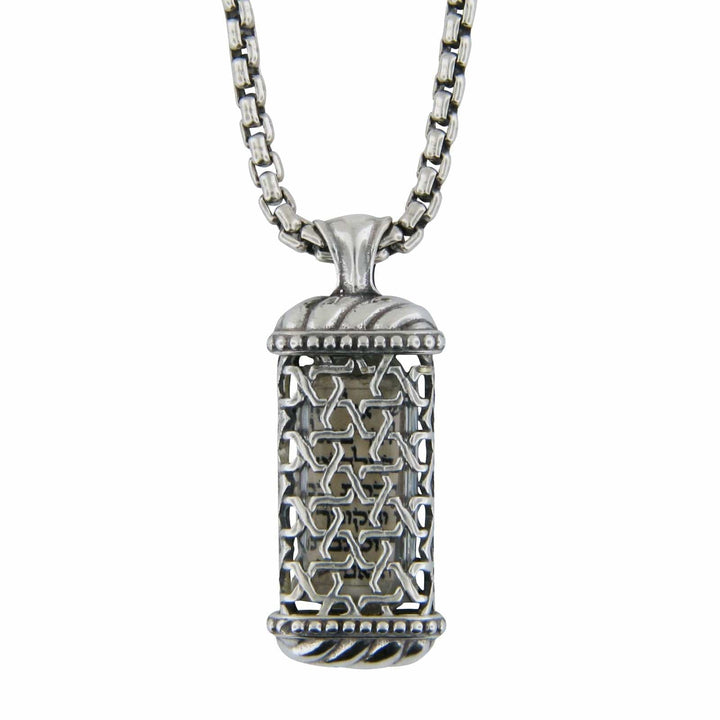 This sterling silver rectangular mezuzah (amulet) necklace features intricate and unique design with cutout Stars of David pattern resembling medieval Moorish Spain (Andalusian) architectural elements covering the body of the amulet. A 14k gold Winged Lion of Judah adorns the front of the amulet. Inside, a parchment which contains the prayer "Shema Yisrael "Hear O' Israel". It is believed that when one wears it or keeps it close to them that they are protected and out of harms way. Please note that the parchment included is not kosher.- Materials: Silver, 14K gold, Shema scroll