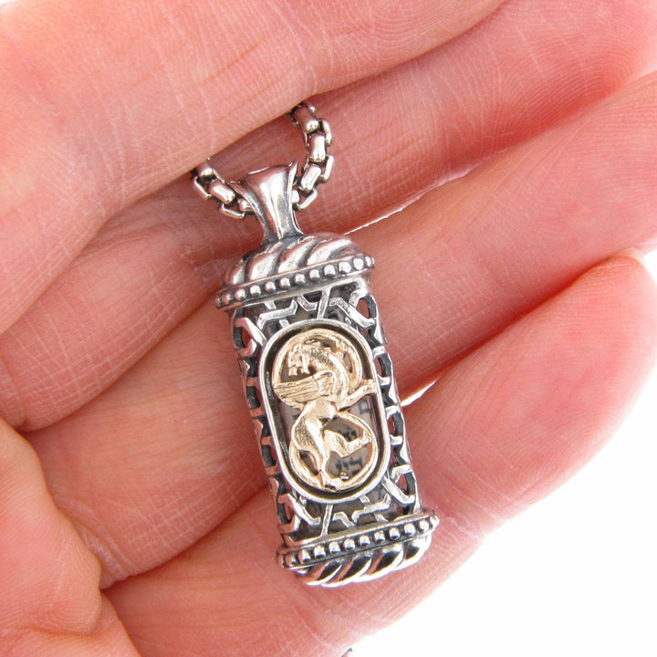 Winged Lion of Judah Mezuzah Pendant Necklace Silver 14K gold Shema scroll on Rounded Box Chan